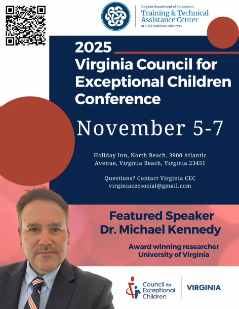 The Virginia Federation of the Council for Exceptional Children holds its annual conference on 5, 6, and 7 November 2025 in Virginia Beach. Registration for the conference is available. Here is the advertising flier: