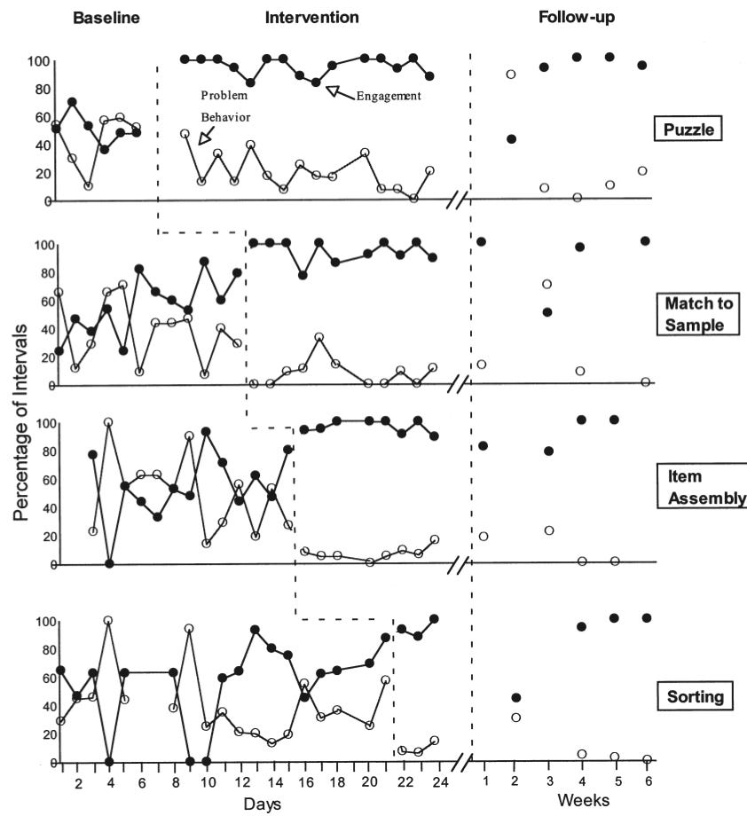 Mindy’s teacher and the researchers, working as a team, reviewed archival records, conducted interviews, and directly observed Mindy’s behavior. Their assessment revealed that the problem behavior occurred “primarily during daily school preacademic activities and transitions” (p. 133). They hypothesized that Mindy’s “problem behaviors were motivated primarily by escape” (p. 133). When she acted up, she got out of the aversive situation.