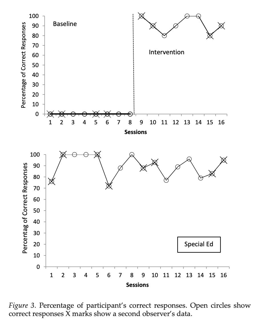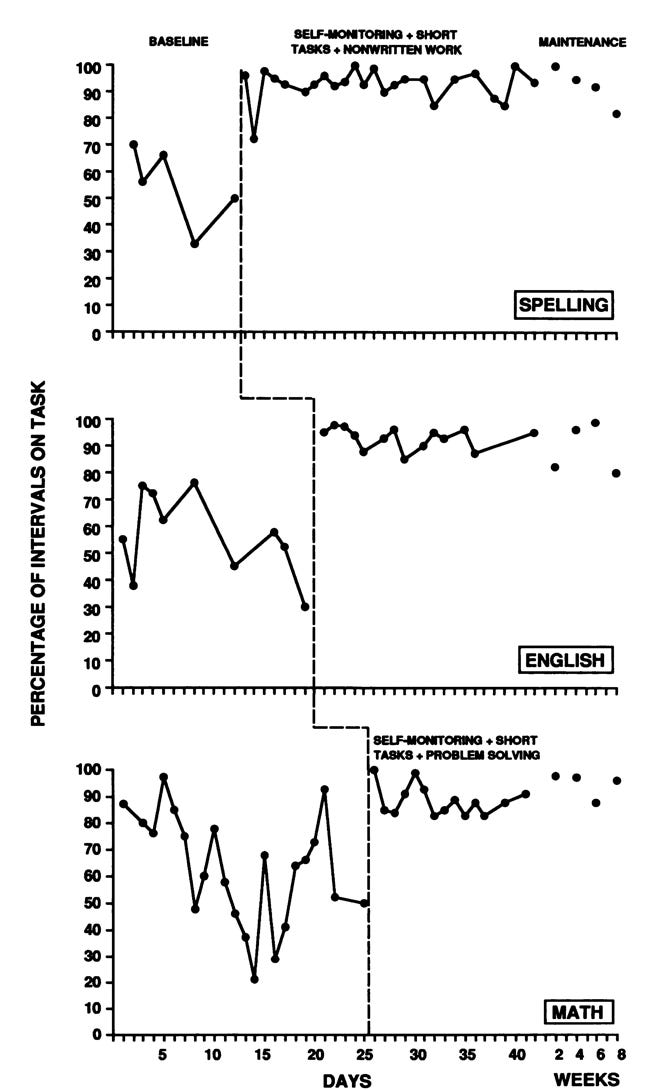 Pre-service teacher education students observed Mikey’s behavior in both the general education and special education setting. First, they observed under baseline conditions and then they continued to observe when the general education teacher implemented a plan: Provide Mikey assignments that were consistent with his skill level, as revealed by the analysis of the errors on his work sheets.