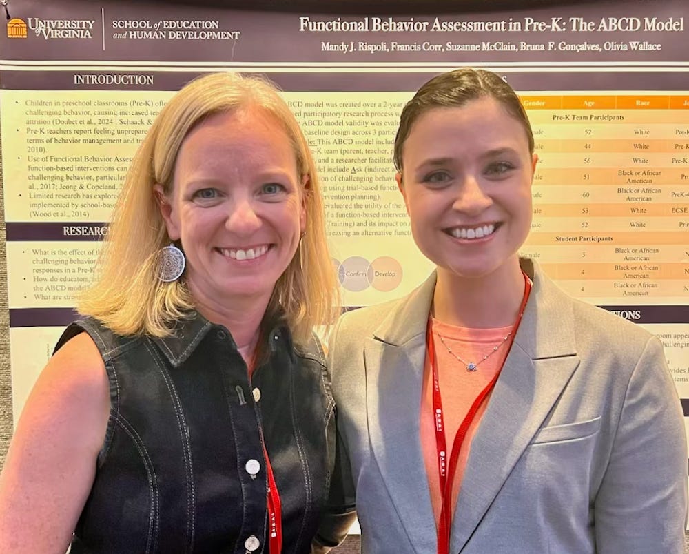 While I (MJR) was attending the conference, I snagged a few photos of attendees and presenters. In this first photo, Virginia PhD student Bruna Gonçalves and I are standing in front of the poster we presented at the conference. The poster describes the community-engaged collaborative project on functional behavior assessment model for pre-k, called the ABCD model (Rispoli et al., 2025).