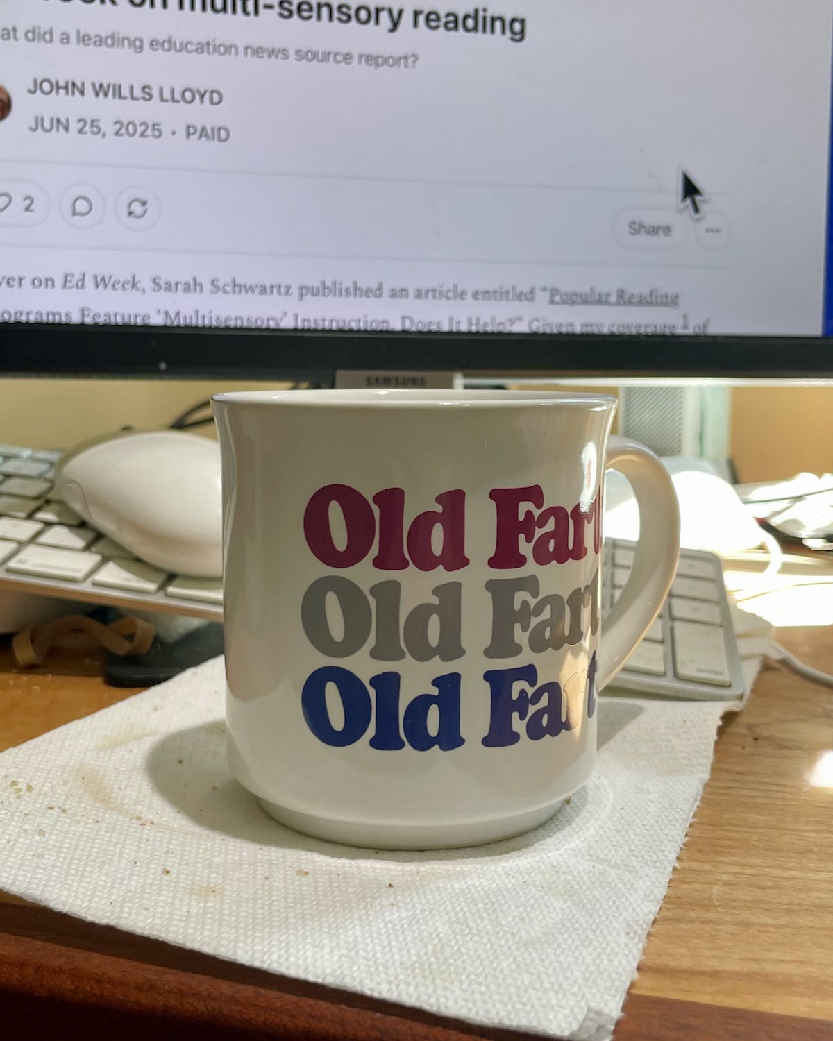 Now, if one closely examines the photo posted here, she may see the background image shows an SET page about multi-sensory literacy. If you do or do not like multi-sensory reading, that should convince you that all three of Pat’s and Corey’s interpretations of the mug message are correct.
