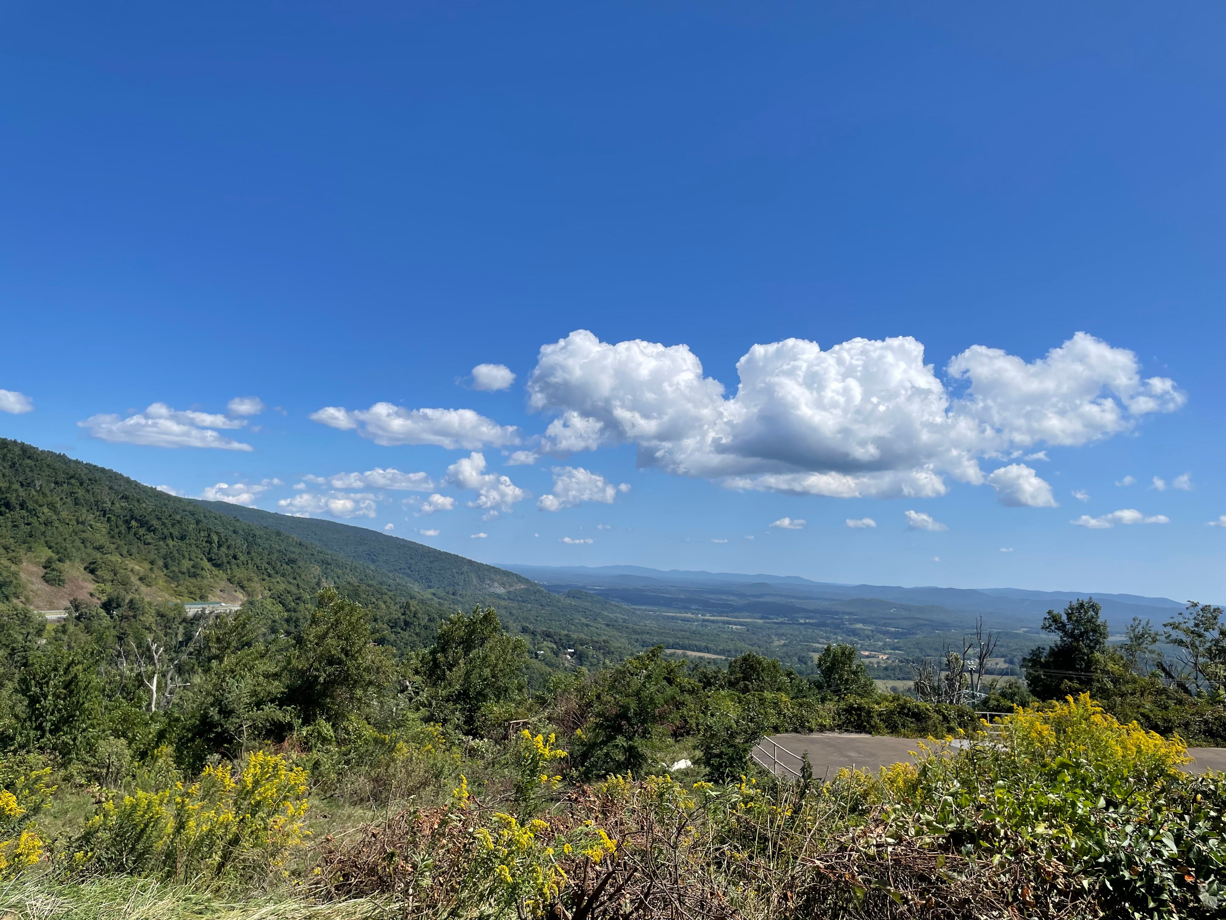 This past week I spent many hours watching migrating birds of prey on “the mountain,” as I predicted in previous newsletters. The view in this photo is more to east; previous photos looked north, so the ridges in the extreme left of this view are those that were pretty much straight ahead in those photos. The road visible from the left toward the center of this photo is Interstate 64 and, if one followed it down hill one would wind up on the outskirts of C’ville (just a tad beyond the clouds, near the right center of the photo) in about 20 minutes.