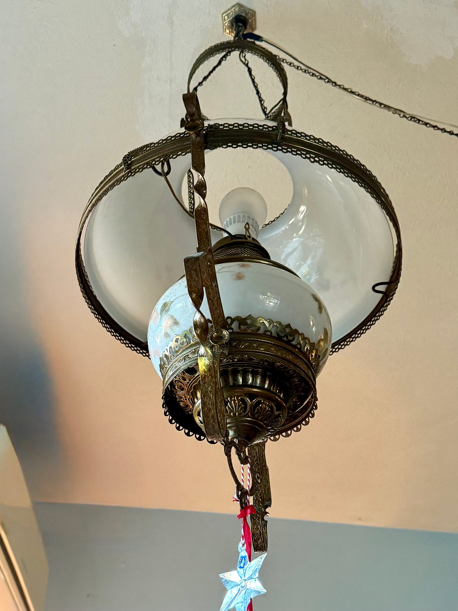 This week, y’all get another of those photos of an historical family item. Here’s a lamp that hung in my paternal grandparents’ house in Manassas, Virginia. I remember it from my childhood in the 1950s but it may have a longer history than that. I can readily imagine that it might it have been an oil lamp—note the big bowl and the place for a wick where there is now a bulb— from an earlier home (Broad Run?) that was later converted to an electrical version?).