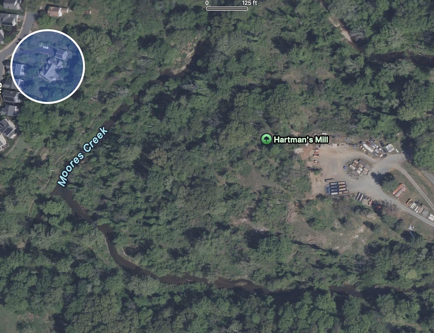 This images shows an arial view of the neighborhood. Our house is in the blue disk at the top left. As one can see, we are adjacent to Moores Creek, which looks like a dark band and makes a loop. To the east of Moores Creek is a large swath of property that is labeled “Hartman’s Mill.” There is a light industry site at Hartman’s Mill and that company is now developing the inside the loop of the creek, just a couple of hundred feet from our backyard. What has been a city sanctuary for local wildlife —birds (Great Horned Owls, Red-shouldered Hawks, Pileated Woodpeckers, migrating warblers, and many more) as well as fauna (we regularly have had raccoon, dear, skunks, and others, including an occasional bear)—is being graded by a big yellow shovel, front-end loaders, bobcats (the metal kind), and dump trucks.