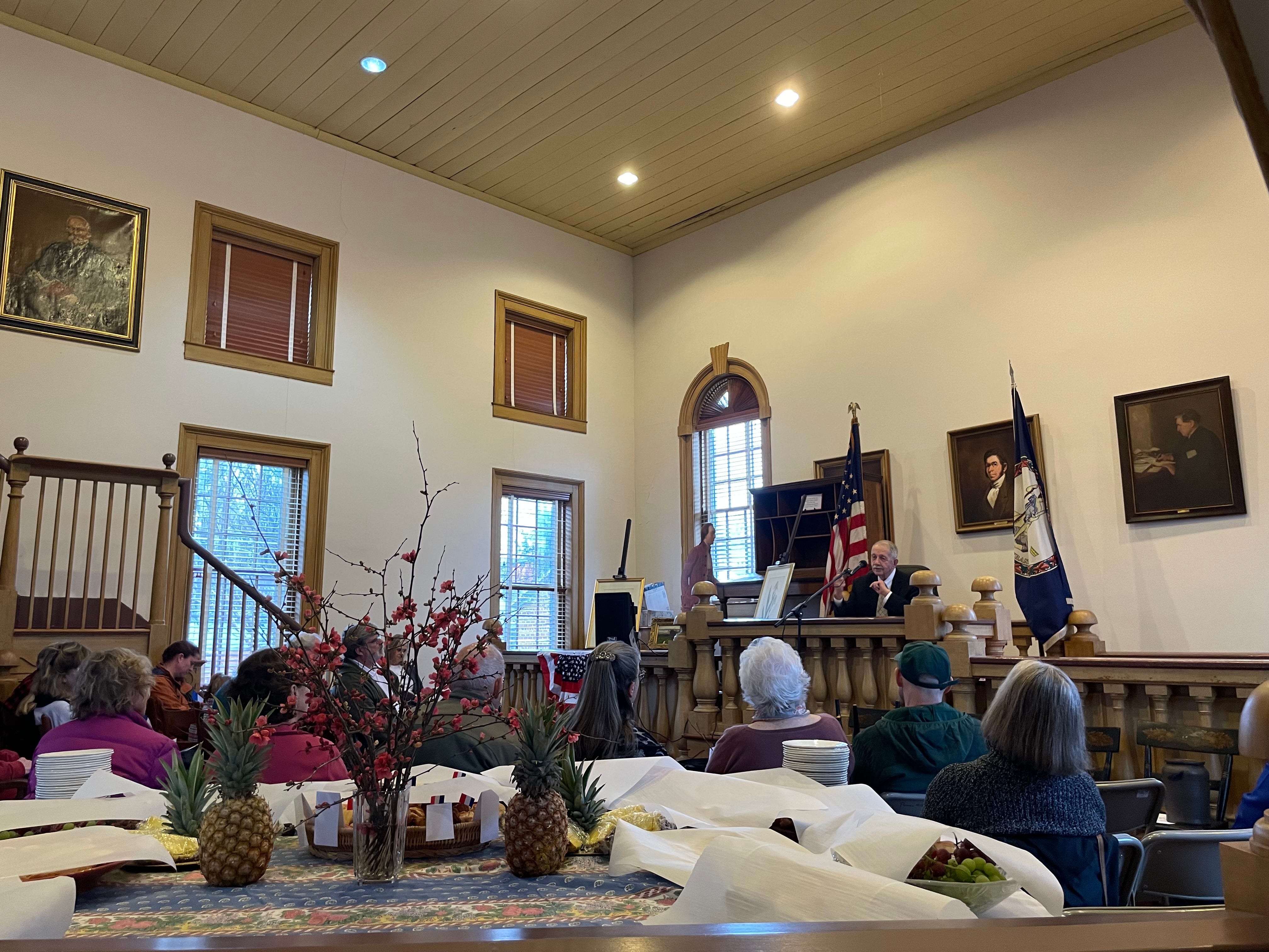 Pat and I were at the old court building because the Fluvanna County Historical Society held a celebration of the 200th anniversary of the time when the Marquise de Lafayette passed through Fluvanna on his way to Charlottesville to visit Thomas Jefferson. As a child I remember hearing my elders point to a brick building at the little crossroads that is called Wilmington and saying “Lafayette slept there,” so I was eager to experience the goings on (a couple of re-enactors spoke and there was singing, food, etc.) at the meeting at the court house. I also have been regularly intrigued by the courthouse because my mother’s father was the Commonwealth’s Attorney for Fluvanna; sitting in it gave me an opportunity to imagine him practicing law 100 years earlier (and also to wonder under what circumstances my mother, as a little girl, got to play there while accompanying him sometimes).