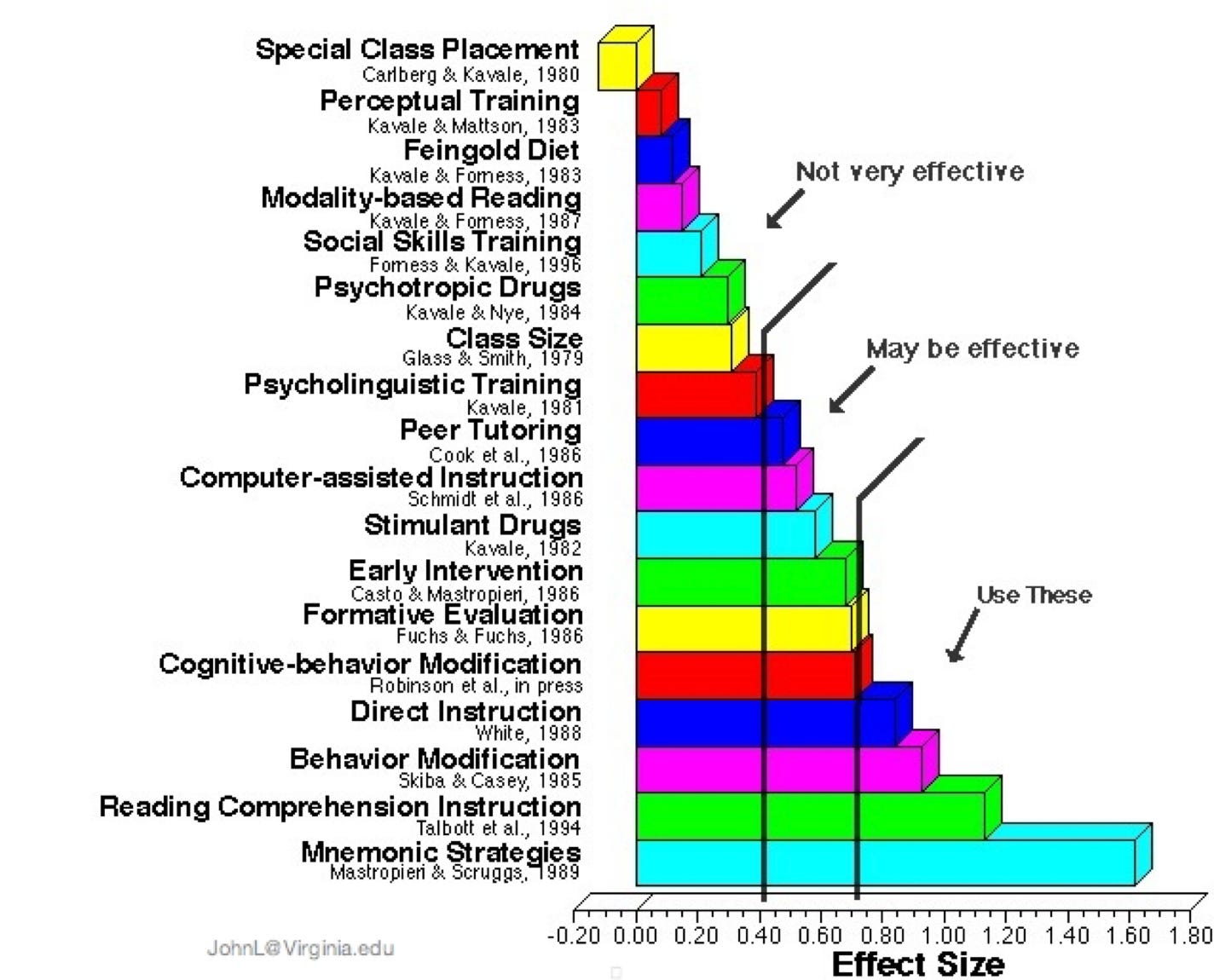 I encourage readers not to employ this image as justification for adopting or rejecting any particular method. It’s important to read the actual article2 so that the findings are not taken out of context. For example the negative finding for special class placement is an average of studies involving students with different disabilities and employing different outcome measures; the average finding masks different results—some of them far greater—for students with intellectual disabilities, learning disabilities, and emotional and behavioral disorders. Similarly, the finding for formative evaluation looks pretty damn good, but it turns out that under that average are results showing even more beneficial effects in some circumstances than in others.