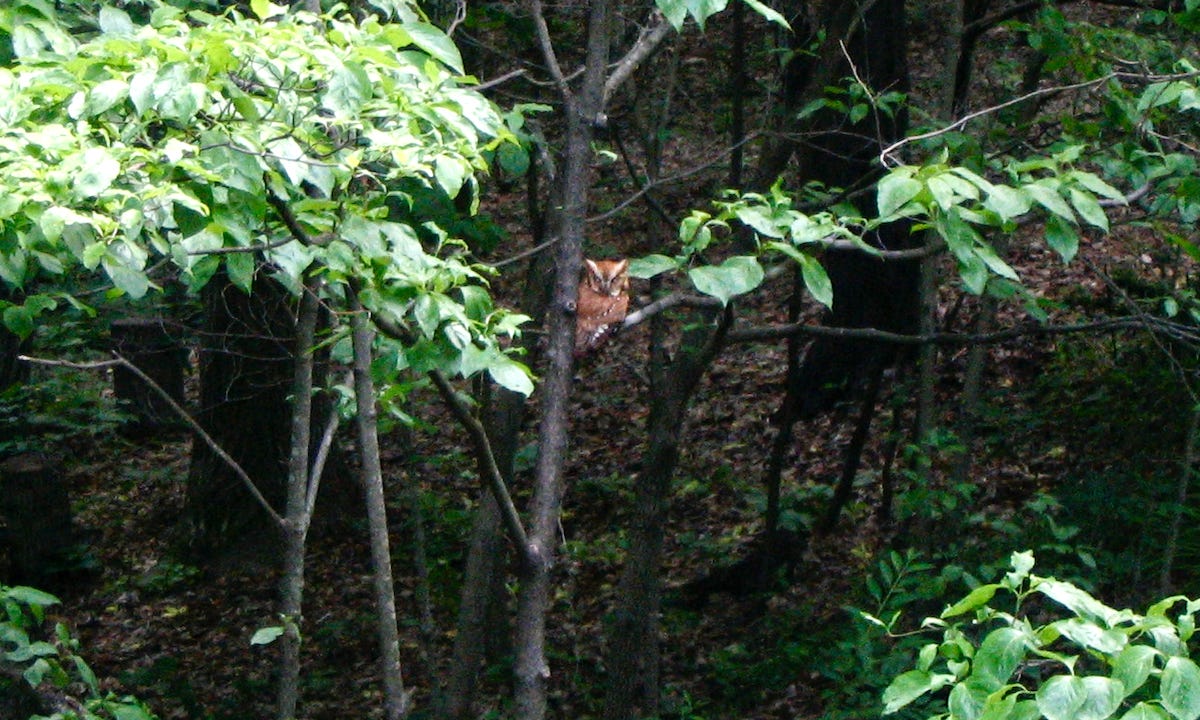 Fun side story: One early morning I was leaving for work. As I drove the 0.4-.5 kilometer gravel driveway to the state road, I saw a flurry of activities in the woods off toward a neighbors’ house. I realized that it was two Eastern Screech Owlets. I put my truck1 into reverse, backed up the lane, got Pat to climb into the truck with me, and went back down the lane to show them to her. We got to observe them for 3-4 minutes. Even though I was later getting to my office than I’d hoped, it was a delightful moment for we two bird watchers.