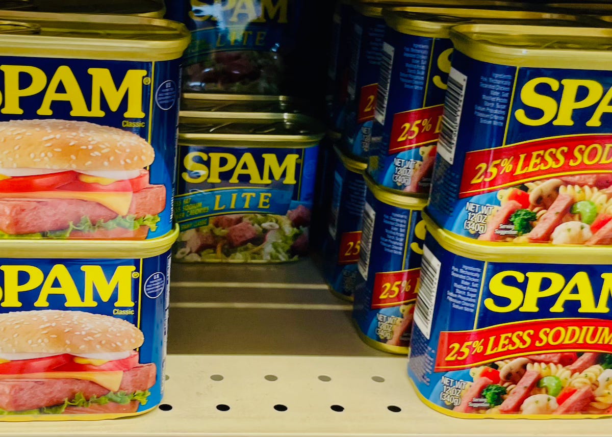 Here’s your spam for this week. I took this shot at my local grocers’ (It’s a big box; I could go a mile or two just walking the aisles). And it obviously refers to a lunch meet familiar to US readers.