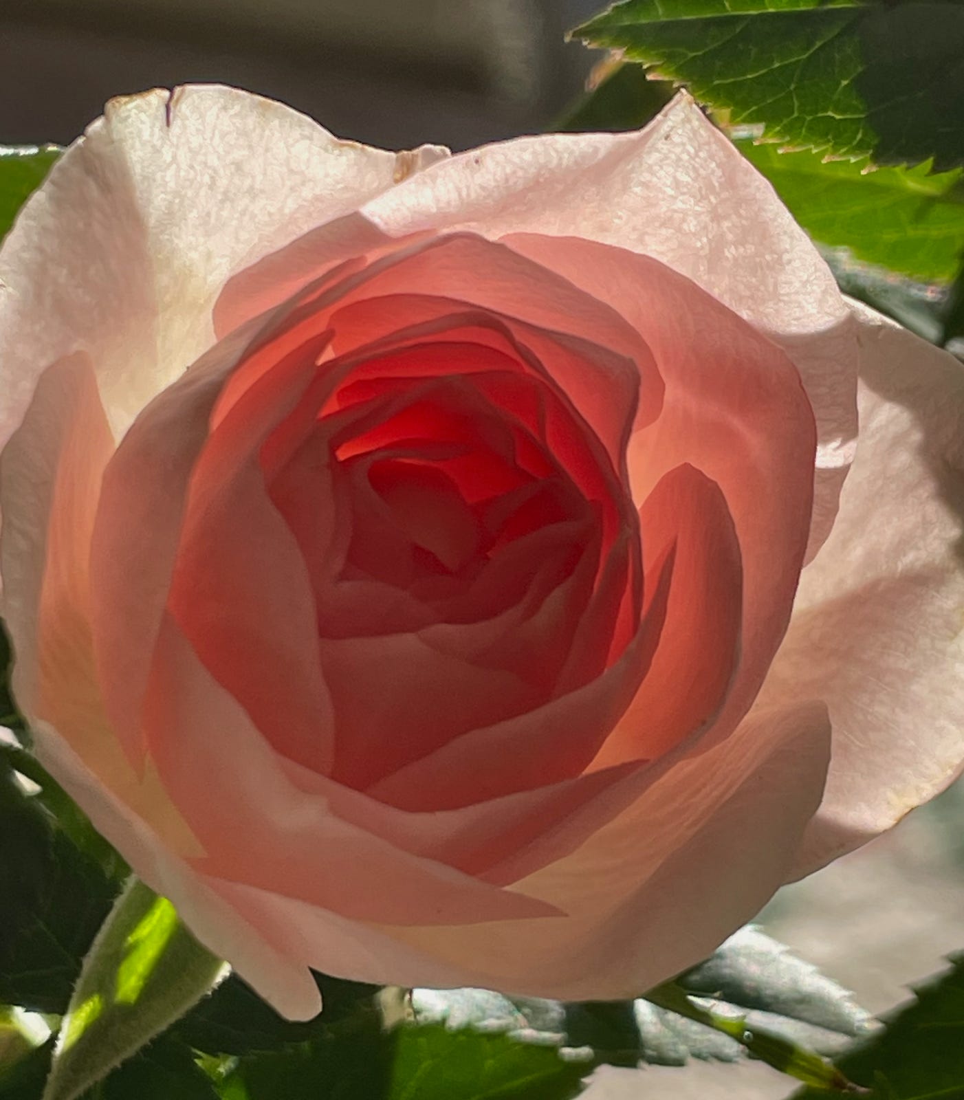 My long-enduring partner sent me this photo of a blossom on a miniature rose. The bush is (currently) potted and sitting on our dining table. I suspect the bush will find its way into the ground somewhere in the yard.