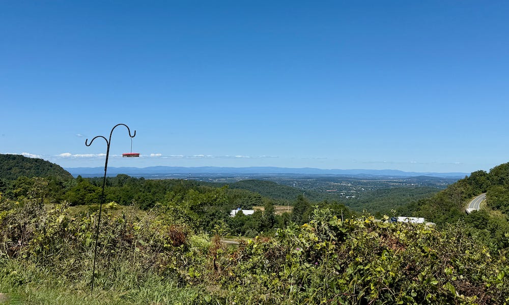 The accompanying photo shows the view to the northwest from a spot where people who observe the hawks congregate. At the bottom right of the photo one can see the southern-most segment of the Skyline Drive going north. The view straight out from the photo is over the town or Waynesboro (VA) and across the Shenandoah Valley to the Appalachian Mountains on the horizon.