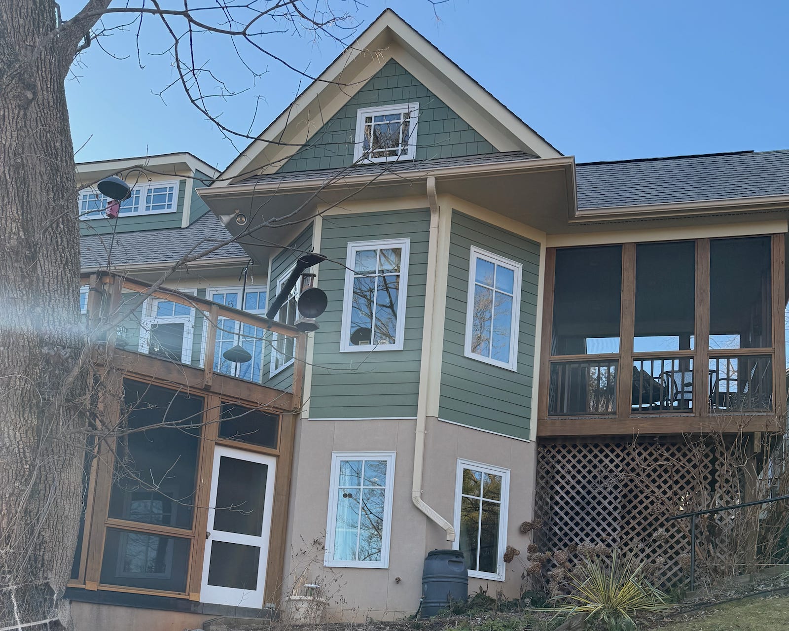 If one was walking along the Rivanna Trail next to Moore’s Creek and turned up hill toward our house, after cutting through about 30 m of brush, one would come upon this view of SET Central. Yep, those lower two windows that flank the rain barrel are the windows for the office from which many words have emanated.