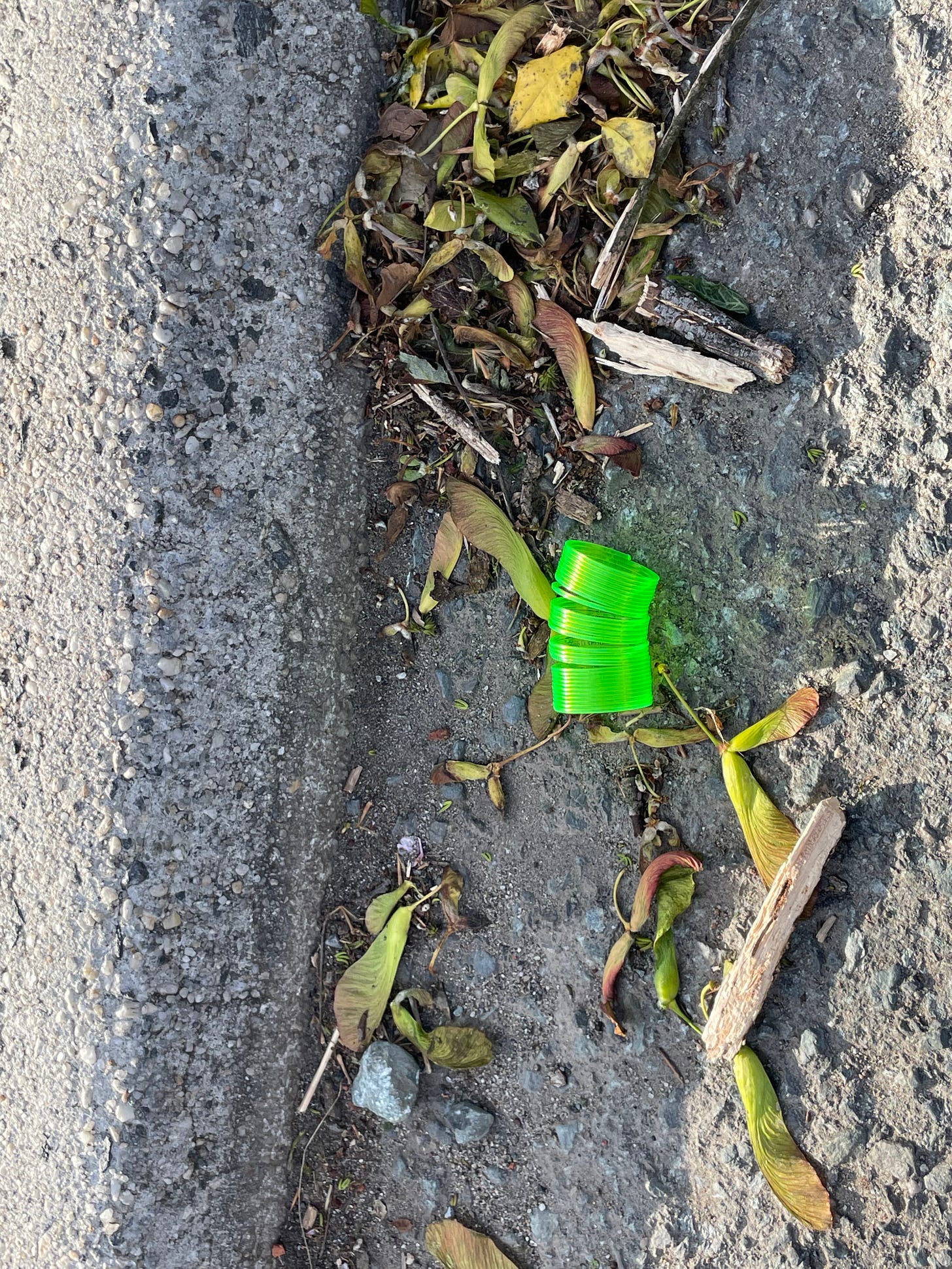 I don’t know what happened to that bracelet that I featured in the earlier post. In the case of the slinky shown here, I brought it home. Pat will put it on a big rock at the top of our driveway. It will join the members of a cache of whimsical objects she keeps there. When no one is looking, perhaps they can have a dance party.