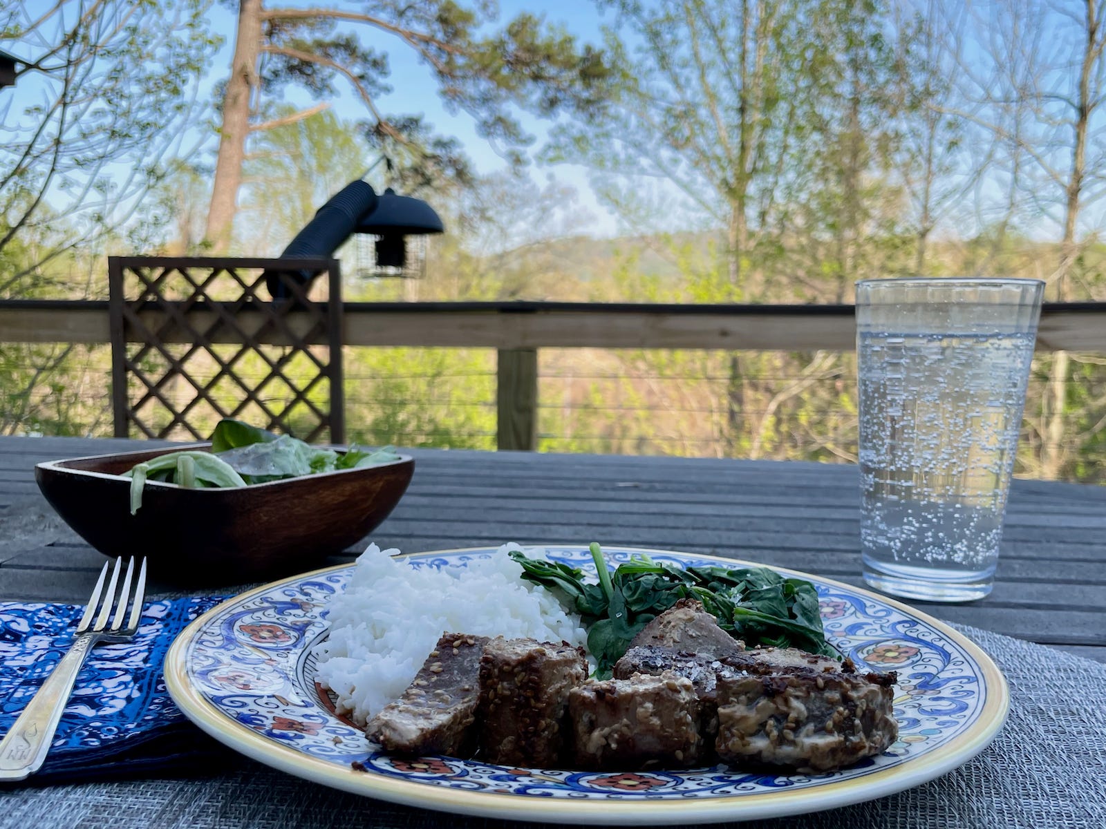 Oh, the meal? Right, it was my night to cook. When it is Pat’s night, she usually makes some full-on vegetarian meal, but my menu for myself was simple: white rice, sautéed tuna with sesame seeds and soy sauce, steamed spinach (hidden bit of butter), with salad and water in the near background.